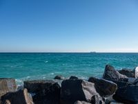 a view of the sea and a ship in the distance at the beach, with large rocks and turquoise water