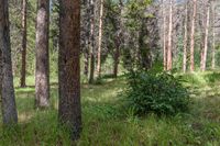 A bear stands next to a bush in the woods of Colorado, looking around the area that it is growing. This scenic landscape photo captures the beauty of the forest during the day, with majestic mountains in the background. The open space and grass surface provide a perfect recreational spot for visitors. Located in Frisco, Colorado, Officers Gulch offers a tranquil setting with tall trees and lush greenery.