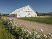 This stunning image captures a picturesque California farmhouse surrounded by lush green grass and vibrant flowers in the foreground. In the distance, majestic mountains provide a breathtaking backdrop. The white barn and farmhouse blend harmoniously into the rural landscape, exuding a sense of tranquility and charm. The clear sky and sunny day enhance the beauty of this idyllic property. With its rustic shed, gravel road, and acres of fertile land, this farm is a testament to the thriving agriculture in California. Whether you're in search of a peaceful retreat or a thriving homestead, this property offers endless possibilities.