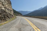 A straight road surrounded by beautiful Canadian landscape in British Columbia. The low-hanging clouds add drama to the scene, while the clear sky offers a stunning contrast. The road surface is asphalt, lined with a rock wall and Armco barrier.