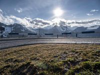 This image depicts a scenic landscape in Austria, Europe. The photo was taken during the day, capturing the sunlight shining on the highland mountains. A road with a curved slope can be seen, along with a guard rail and Armco barrier for safety. The clear sky and sunny weather create a pleasant natural environment. The sun is visible in the profile of the mountains, casting a beautiful light on the cobblestone road. This picture represents the highlands of Austria and showcases the beauty of the European landscape.