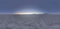 a view of the sun rising over a barren plain with snow all around it and mountains in the distance