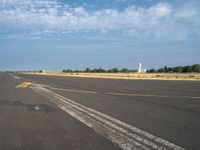 the empty runway has a single airplane in it and a bright blue sky with clouds