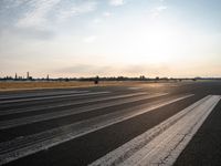 A Berlin airport runway with painted lines reflecting the setting sun. Clear skies and urban landscape create a picturesque scene. The open space of the airfield contrasts with the busy city life surrounding it.