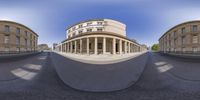 Fish-eye view of Neues Museum in Berlin, Germany. Ancient Roman architecture with symmetrical columns and handrails. Classic design contrasts with modern city life. A tourist attraction in the heart of Europe.