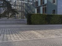 A person walks on the sidewalk in Berlin, amidst modern architecture and lush greenery. The urban design of the city blends seamlessly with its business district. Discover Europe's dynamic and vibrant capital.
