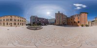 A classic example of Berlin architecture, this large brick building stands out in the city's urban design. Surrounded by other brick buildings, it creates an open space in the courtyard. Straight down the road, it leads to a hotel and a museum. Clear skies and hard shadows add to the city's charm.