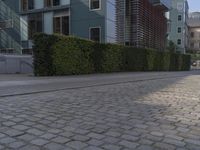 This image showcases the modern architecture of Berlin, Germany. The photo captures a city street lined with office buildings and urban design. The buildings feature a mix of brickwork and glass windows, creating a unique urban landscape. The road surface is made of asphalt, with cobblestone curbs adding to the charm of the area. In the foreground, there is grass and vegetation, providing a touch of nature amidst the bustling city. This photo represents the business district of Berlin and highlights the fusion of old and new in European architecture.