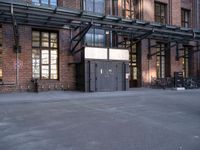 A classic architecture building in Berlin with a brownstone facade. The urban design features a symmetrical entrance and a courtyard. The empty parking lot with bicycles adds to the city life vibe.
