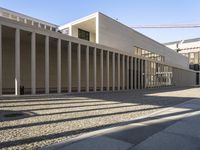 A classic and modern blend of architecture in Berlin's city center. The concrete building stands tall against a clear sky, with extended walkways and large white columns. This structural masterpiece showcases the city's urban design.
