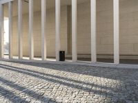 a street in front of a pillar next to some white columns and a black lamp