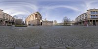 A fisheye lens captures the reflection of three classic architecture buildings in the center of a street in Berlin. The symmetrical facade and straight road create a sense of urban design and city life.