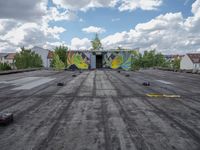 This is an image of the cityscape in Berlin, Germany. The architecture shows a mix of residential areas, buildings, and open spaces. The road, lined with yellow lines, is made of asphalt and is surrounded by trees. The buildings have different facades and structures, adding to the diversity of the cityscape. In the distance, there are clouds in the clear sky. The image captures the urban atmosphere of Berlin, with its graffiti walls and street art, reflecting the vibrant and artistic nature of the city. This photo represents a typical day in Berlin, a metropolitan area in Europe.