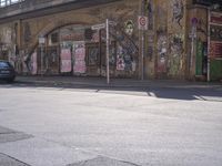 This image captures the vibrant city life of Berlin, Germany. The person in the foreground is walking across a street flanked by buildings with graffiti-covered walls. The diverse architecture of the city is showcased, from classic buildings to modern facades. The road surface, asphalt, and underpass add to the urban atmosphere. In the background, a bridge and vehicles can be seen, demonstrating the bustling nature of the city. This photo represents the unique blend of art, architecture, and culture that can be found in Berlin, making it a must-visit destination in Europe.
