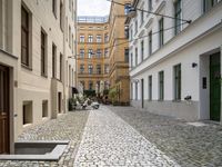 This stock photo features a classic architecture in Berlin. The cobblestone road leads to a suburban area with charming residential houses. The road's surface reflects the vibrant urban design of Berlin. The courtyard in the Hinterhof is a peaceful retreat in the midst of the bustling city. The photo was taken during the day, capturing the beauty of the architectural details in this classic Berlin plaza. The image showcases the timeless elegance of urban architecture in Berlin.
