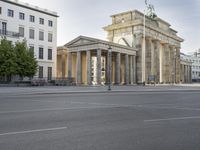 This stock photo features a stunning architectural structure in Berlin, Germany. The building, reminiscent of ancient Roman design, showcases classic architecture with prominent columns and pillars. Set against a clear sky, this tourist attraction highlights the vibrant city life and urban design of Berlin. The image captures the beauty of this European city, known for its historic landmarks and tourist-friendly atmosphere. The Brandenburg Gate, a symbol of German unity and a popular tourist spot, can be seen in the distance. This photo is perfect for showcasing the charm and allure of Berlin's architecture and its rich cultural heritage.