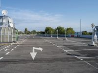 This image shows an empty parking lot in Berlin, Germany. The clear sky above contrasts with the modern architecture of the surrounding residential area. The straight road leads to the parking deck, which features satellite antennae on top. This urban design represents the city life in Berlin, with its open spaces and modern architecture. The arrow pointing to the left indicates the direction of the road. This photo captures a typical day in the urban landscape of Berlin, Europe.