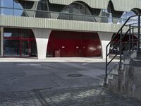 This stock photo showcases the unique modern architecture found in Berlin, Germany. The image features a set of concrete steps leading up to a building with vibrant red doors. The surrounding area is a mix of residential houses and open spaces, creating a perfect blend of urban design and nature. The clean lines of the building's facade and the contemporary arch add to the overall aesthetic appeal. The artwork on the doors and the metal wheel near the curb add a touch of artistic flair. This image captures the essence of city life and the business district in Europe's dynamic capital city.