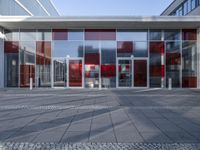 This stock photo features a large red building in Berlin, Germany. The building showcases modern architecture with multiple glass panels on its front doors and exterior. The vibrant red facade stands out against the clear sky, creating a striking urban design. This property can be used as an office building, shop, museum, or storefront in the bustling business district of Berlin. The glass walls and open spaces create a bright and inviting atmosphere, perfect for city life. The combination of the red facade, sleek lines, and glass surfaces make this building a stunning example of contemporary architecture in Europe.
