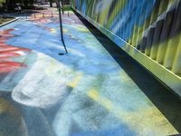 This image captures the vibrant city life of Berlin, Germany. The modern architecture and open spaces create a unique urban design. The photo showcases a high-rise building with a blue reflection in the water, surrounded by concrete walkways and asphalt roads. The multicolored graffiti on the walls adds a touch of artistic flair to the scene. In the courtyard of an urban warehouse, a graffiti wall stands as a centerpiece, representing the dynamic art district. The elevated walkway and the shadow it casts reveal the architectural elements of the city. This photo depicts the energetic and creative atmosphere of Berlin.