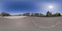 A modern cityscape in Berlin, Germany. Straight down the road, lined with high-rise buildings and corporate headquarters. The clear sky offers a perfect backdrop to the urban design and modern architecture. A popular tourist attraction for both cyclists and pedestrians.