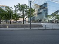 A modern office building in Berlin, Germany. The architecture of the city reflects a blend of urban design and modern aesthetics. The business district stands tall against a clear sky, casting shadows on the asphalt road.