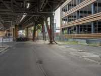 Straight down the road in Berlin, Germany, with classic architecture lining the urban thoroughfare. The road leads to a large building under an overpassy bridge, showcasing the city's art district. A perfect blend of Europe's classic and modern architecture.