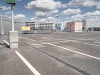 A view of a parking lot in the city of Berlin. The clear sky and modern architecture of the buildings create a stunning backdrop. The urban design of the area is evident with the open space and asphalt road. This photo captures the essence of city life in Berlin, Europe, Germany.