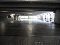 This stock photo showcases the urban architecture of Berlin, Germany. The city is known for its modern architecture and well-designed infrastructure. The photo captures a straight road lined with parking decks and showcases the grey concrete street and tints and shades of the city. The image illustrates the urban design and city life of Europe, providing a view from above with a parallel line composed of composite material flooring. The day-time shot gives a glimpse of open spaces and the city's ceiling fixtures, creating a dynamic composition.