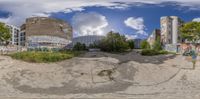 a fish eye view photo of an old abandoned building and park bench in front of some other apartment buildings