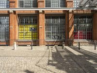A bright yellow brick building in Berlin's art district. The vibrant facade stands out against the industrial surroundings. Three benches are strategically placed next to the front door, creating an inviting open space in the city.