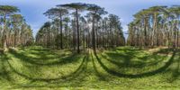 A panoramic view of a field with trees growing on the outskirts of Berlin. The fish eye lens captures the lush green landscape and the straight road leading into the distance. A serene and natural scene in Brandenburg.