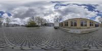 A classic Berlin street with symmetrical rows of brick buildings. Cobblestone road surface leads to a wide road with a cloud-filled sky. This urban design showcases the city's historic architecture and infrastructure.