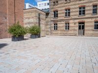A classic brick sidewalk lined with tall buildings in Berlin. Trees in pots add a touch of nature to the urban landscape. Open courtyard and museum create a harmonious blend of city life and classic architecture.