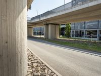This image captures the modern architecture and infrastructure in Berlin, Germany. A clear sky above highlights the sleek lines and facades of buildings and bridges. The road surface, made of asphalt and concrete, is lined with trees and columns. This photograph represents the real estate and urban development in the city. The different textures and materials create a visually appealing scene, showcasing the combination of historic and modern elements. Berlin is known for its unique blend of architecture and this photo captures its essence.