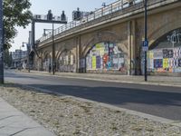 Older bridge in Berlin, Germany, adorned with graffiti on its walls and walkways. The urban art district is a vibrant showcase of street art. Trees and vegetation line the thoroughfare, creating a unique atmosphere.
