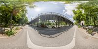 A fisheye view of a bridge and roadway in Berlin, Germany. The straight road is lined with trees and parked cars. The clear sky above highlights the city's architectural beauty. A perfect day to explore Berlin's urban design.