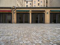 This stock photo features a building in Berlin with glass doors on the side of the road. The street in front of the building showcases a traditional brick wall and a cobblestone road surface. The building's architecture represents classic European design. The courtyard in the open space offers a glimpse of the city's real estate and adds charm to the urban landscape.