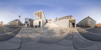 a fish eye lens lens view of a building with a staircase in the background, and a parking lot in front