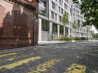 A modern office building in Berlin's business district. Cobblestone surface with yellow-painted sidewalk. Trees surround the empty building, adding to the architectural allure of the city.