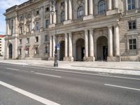 A daytime view of Berlin's business district, showcasing classic architecture and urban design. The road is lined with office buildings and museums, capturing the essence of city life in Berlin.