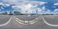A high-angle fish-eye view of a road in Berlin's modern architecture district. The straight road stretches towards a clear sky, lined with high-rise buildings and office towers. The cityscape is illuminated by street lights, creating a vibrant city life.