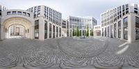 Circular stone courtyard in Berlin's business district. Skyscrapers reflect on the panorama lens. Modern architecture and beige facade dominate the cityscape. Open space and walkways provide a welcoming environment in this bustling European city.