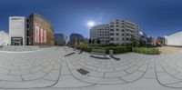 this is an image of a circular panoramic view of buildings, with a person on the street