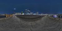 a fisheye photograph of a walkway and a body of water at night with a few buildings in the background