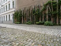 This image captures the essence of urban living in Berlin, Germany. The classic architecture of the residential buildings is adorned with cobblestone roads and green courtyards. The facades display large windows and intricate details. The urban design features a mix of public spaces and suburban areas, creating a dynamic city life. The ground is covered with grass and various types of vegetation, including a vertical garden and a green wall. This photo showcases the beauty of Berlin's architecture and the harmonious blend of nature and city elements.