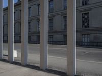 A skateboarding scene in Berlin, showcasing the city's unique blend of classic and modern architecture. The skateboarder rides in the foreground, with concrete columns and road surface in the background. A snapshot of urban life in Europe's urban design capital.