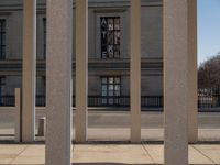 the large building has columns that are next to it, there is a sky background