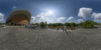 A straight road in Berlin, Germany, lined with modern architecture. The surface reflects the clouds during the day, casting hard shadows. An urban design that showcases the city's vibrant and dynamic atmosphere.
