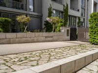 This is an image of a modern residential building in Berlin, Germany. The architectural design is characterized by clean lines and rectangular shapes. The building is surrounded by a well-maintained residential area with lush green grass and vegetation. The image captures the vibrant city life of Berlin, with people walking on the asphalt road and light fixtures illuminating the surroundings. This photo represents the urban design and modern architecture in Europe's capital city.
